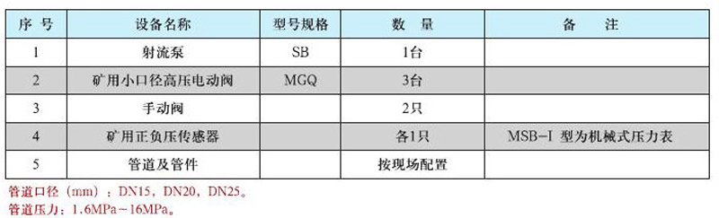 MSB礦用射流泵總成是由SB型射流泵、MGQ礦用小口徑高壓電動閥、正負(fù)壓傳感器、管道勝管件組成。主要供大、中型水泵去掉底閥后能吸上引水,從而實(shí)現(xiàn)水泵無底閥運(yùn)行。既能減輕勞動強(qiáng)度,又能達(dá)到顯著的節(jié)電效果,每噸位耗電節(jié)省5%~27%左右。