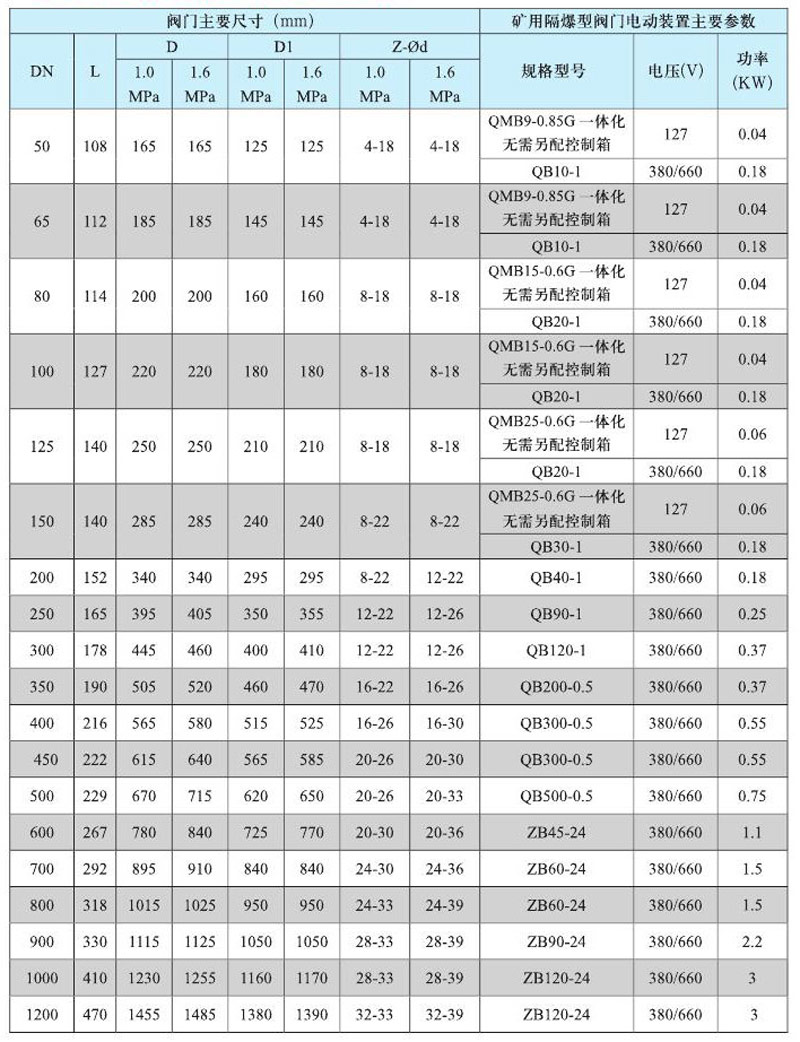 連接尺寸與相關礦用隔爆型閥門電動裝置選配表