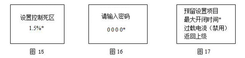 若配置調節型主控板,設置菜單如(圖14)所示:通過操作旋鈕的打開操作,可移動光標位置。在光標停留選項上,通過操作旋鈕的關閉操作,可選中該選項。被選中的選項,將被標注“*”若光標在控制死區位置按下確認鍵,可進入控制死區的設置如圖(圖15),控制死區決定調節型閥門的控制精度,可在“自適應-0.5%-10.0%之間調整”。調整時考慮閥門慣沖量等因素不可設置過低的死區值,以免引起閥門震蕩,推薦控制死區1.5%-2.5%。