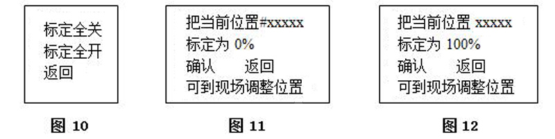 4.7.3.4全關標定如(圖10):進入標定全關,將閥門關到全關位置標定為0%、xxxxx處顯示編碼器檢測到的開度^值數(0~65535)在此界面下,光標在確認處按下設置確定鍵,即成功把當前位置標定為全關位置,顯示比例0%;光標在返回處按下設置確定鍵如(圖11)所示,直接返回到上級菜單。