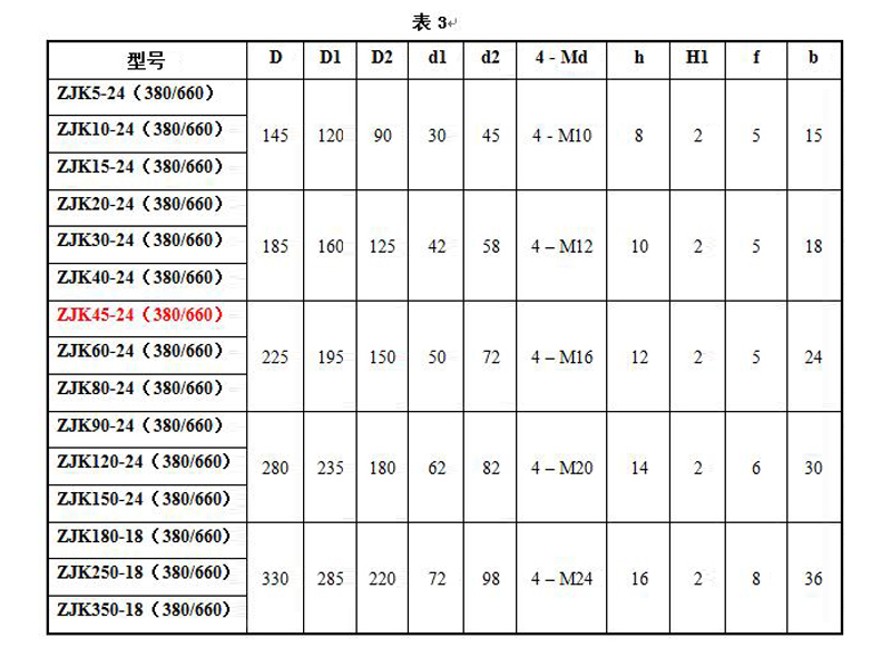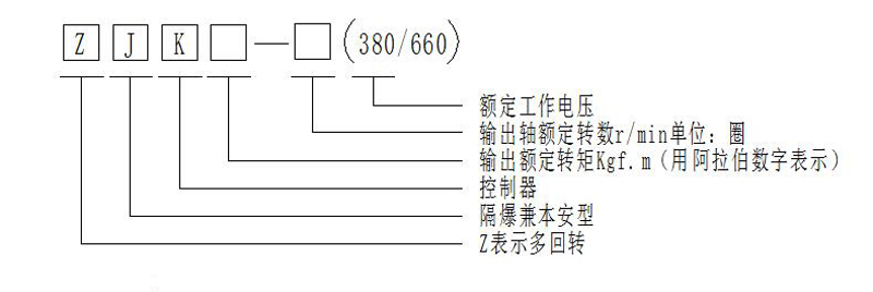 ZJK45/24(660):表示多回轉、隔爆兼本安型、輸出轉矩450N?m(45kgf?m)、輸出轉速24 r/min,額定工作電壓為660或380V的電動裝置。