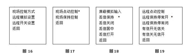 4.7.3.8現場控制方式如(圖16):現場控制方式可選擇點動或自保持兩種模式如(圖17)。通過操作旋鈕的打開操作,可移動光標位置。在光標停留選項上,通過操作旋鈕的關閉操作,確認選中該選項。被選中的選項,將被標注“*”