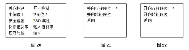 4.7.3.11參數設置如(圖20):參數的設置需要專業人員完成。主要設置內容包括:開、關向限位方式、模擬信號斜率、調節型死區設置等。具體如下: