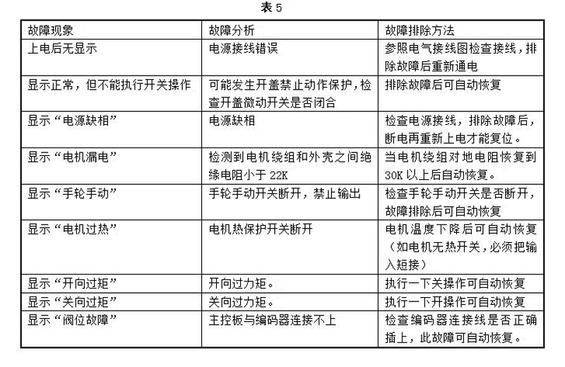 4.5.4過力矩保護:當電動執行器向開向或關向運行出現卡澀故障時,將信號送進控制箱模塊(開關量信號)中,模塊實現單方向保護,實現單方向鎖定,解鎖時需向相反方向運行3s,即可實現解鎖或停電解鎖;當出現開閥、關閥兩個方向卡澀故障時,雙方向運行均能保護,模塊實現雙方向保護,并應停電解鎖。